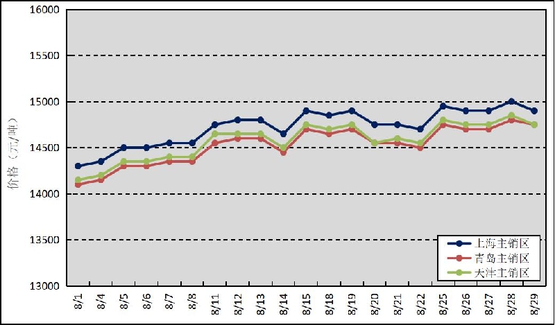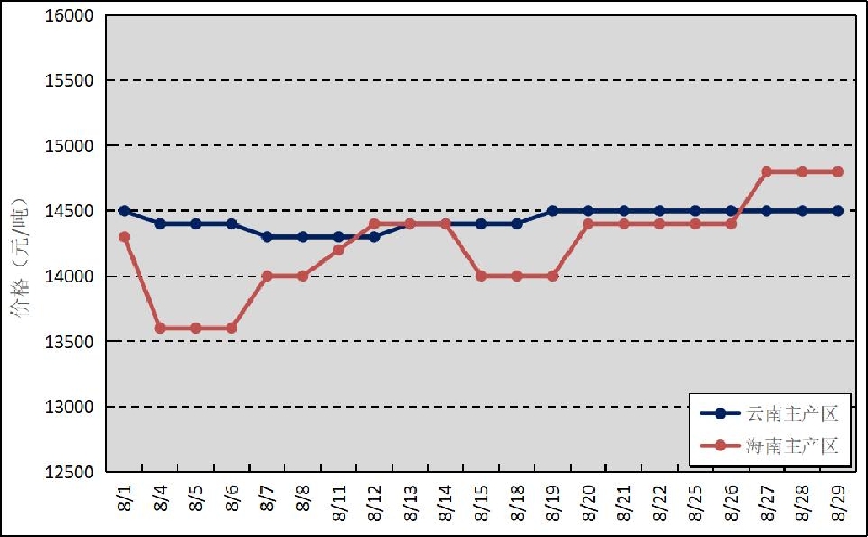 圖3  2025年8月國(guó)內(nèi)主銷區(qū)天然橡膠價(jià)格走勢(shì)