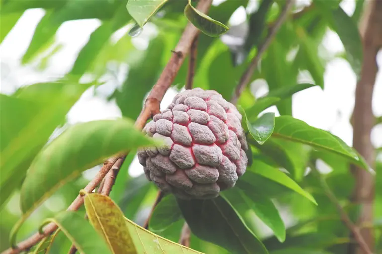 盛夏時節(jié),溫熱的陽光下,一顆顆紫色釋迦掛滿枝頭,閃爍著玫瑰色的光亮,散發(fā)著玫瑰的香味。這是三亞育才生態(tài)區(qū)那受村引進的“新奇特優(yōu)”水果之一,因其獨特的口感和市場的稀有,受到廣大消費者的青睞。
