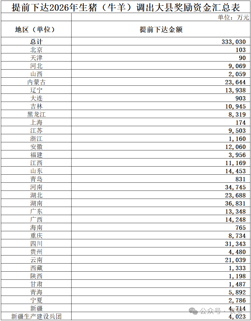 按照預(yù)算管理及有關(guān)規(guī)定,經(jīng)研究,現(xiàn)提前下達(dá)你省(自治區(qū)、直轄市、計(jì)劃單列市、新疆生產(chǎn)建設(shè)兵團(tuán),以下統(tǒng)稱?。?026年生豬(牛羊)調(diào)出大縣獎(jiǎng)勵(lì)資金預(yù)算(項(xiàng)目名稱:生豬(牛羊)調(diào)出大縣獎(jiǎng)勵(lì)資金,項(xiàng)目代碼:10000015Z155070000001,具體金額見(jiàn)附件),收入列2026年政府收支分類科目“1100299 其他一般性轉(zhuǎn)移支付收入”。該項(xiàng)資金為2026年生豬(牛羊)調(diào)出大縣獎(jiǎng)勵(lì)資金預(yù)算的預(yù)下達(dá),最終獲支持縣市區(qū)名單和具體金額將于2026年根據(jù)有關(guān)因素按程序確定,多退少補(bǔ)。