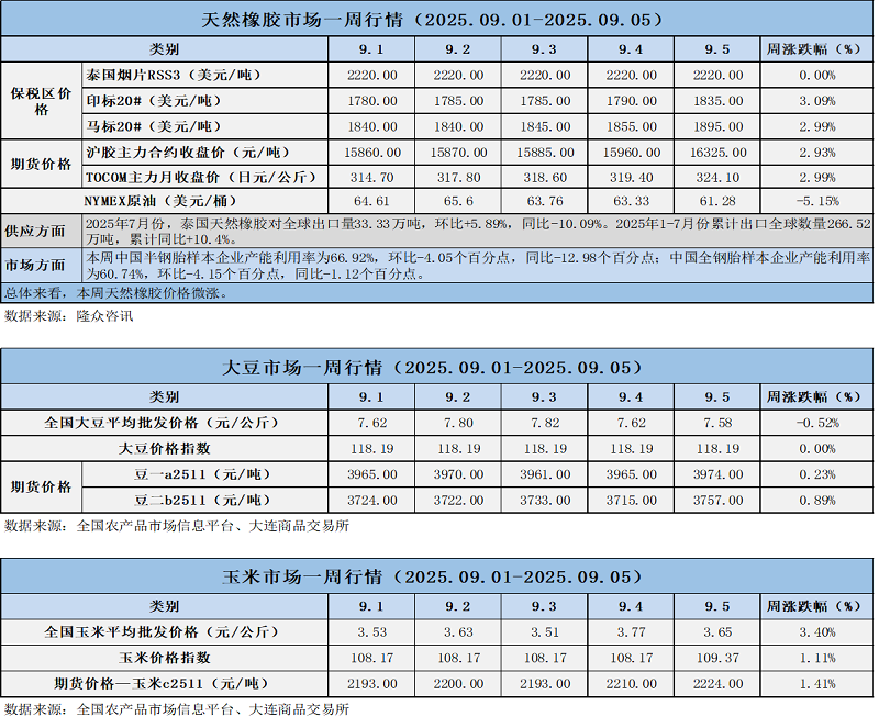 天然橡膠、大豆、玉米市場(chǎng)一周行情(2025.09.01-09.05)